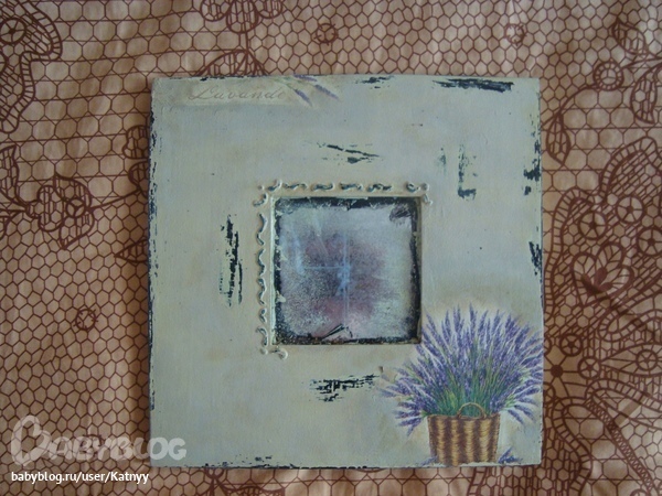 Зашкурила в местах "со свечой" Приклеила мотивы. Сделала тени масляной пастелью.