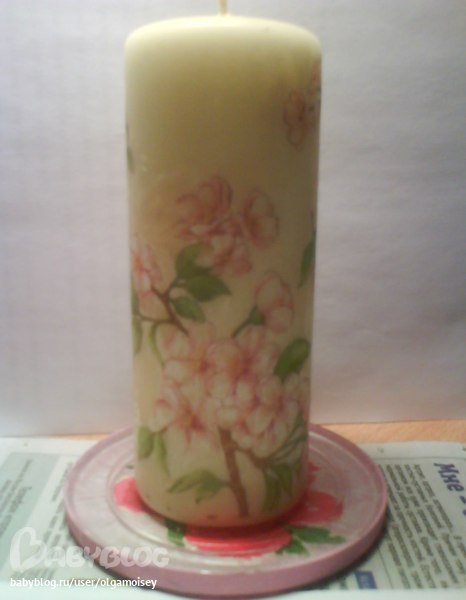 Посоветуйте! (обсуждаем черновые работы)ДВ, задекорировала свечу Ход работы: свеча готовая, отделила от салфетки 3 слой с рисунковм, втопила салфетку с помощью горячей ложки в свечу Посоветуйте, пжл, надо декорировать верх свечи нежно розовымми точечным рисунком Спасибо