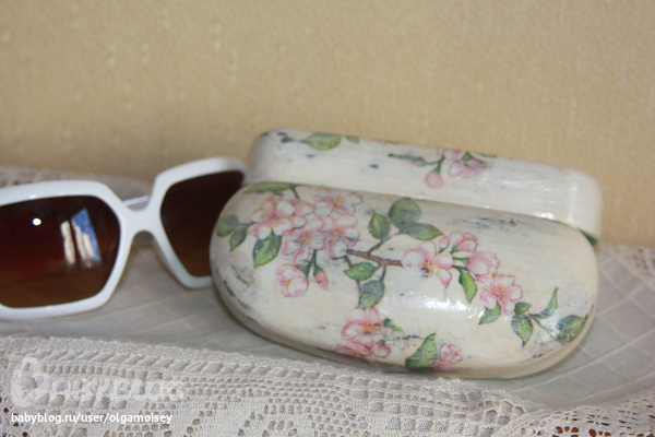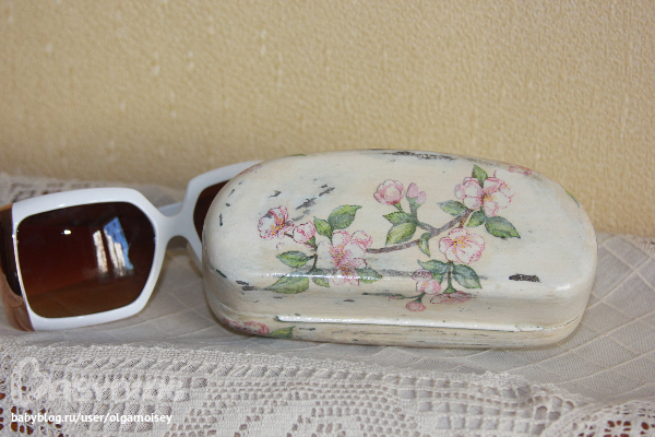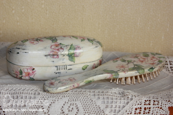 загрунтовала расческуу и очечник, просушила, нанесла местами коричневую краску, просушила, натерла свечкой темные места, добавила каплю охры, еще раз прокрасила, просушила, прошлась шкуркой получла потертости, наклеила мотив, покрыла лаком, мотив несколько ярковат, затонировала чуть бежевой краской и покрыла лаком Расческу делела 1-вой, лак дал желтезну, очечник покрывала др составом