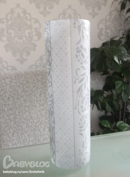 На клей ПВА наклеила один белый слой салфетки со складочками, решила, что хочу в итоге иметь гладкую вазу, для этого нанесла несколько слоёв лака с последующей шлифовкой каждого слоя. Чтобы ресунок салфетки состыковался, разрезала полосками и подобрала по размеру. Наклеивала каждую полоску с последующей просушкой. Оставила на ночь. Итог рисунок салфетки почти не виден, т.к фон не белый, а полупрозрачный, эфект складочек тоже только на просвет. Я конечно попробую контуром обыграть, но и то это можно использовать только на случай большого количества цветов в доме и нехватки ваз.