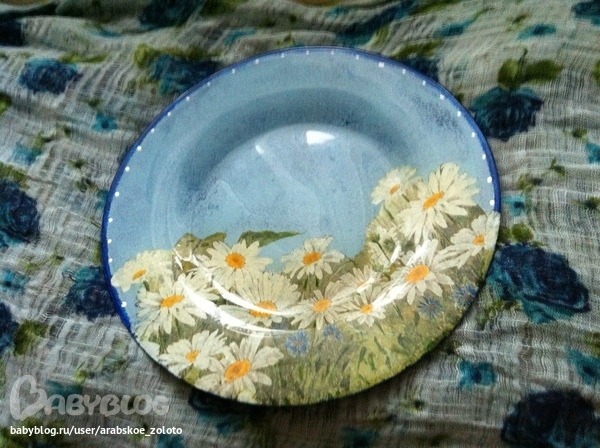 Сюда надо было выбирать небесно-голубой цвет, чтоб была иллюзия неба, ну и...ОКАНТОВКА - она до конца убила работу! Кать, ну почему такой ядовитый синий? Если бы внутри был нежно голубой, то окантовку можно было сделатьцветом серединки ромашек + это бы таило скрытый смысл присутствия солнца на тарелке и все! Природа сама все подсказывала тут все....ну и мошки, бабочки, стрекозки...