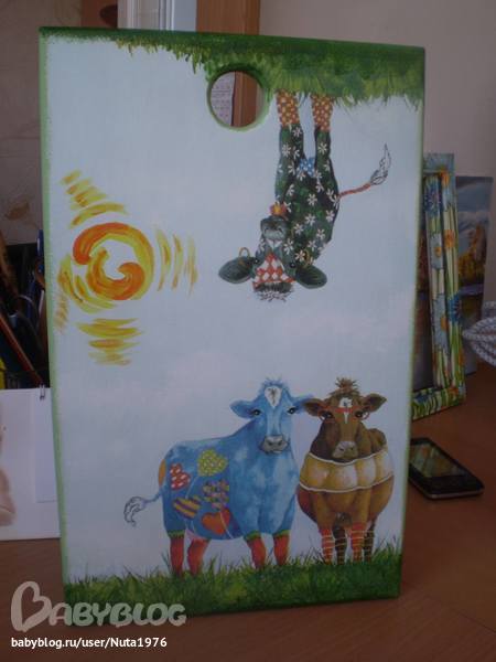 Но в этом и есть идея композиции: как ни переверни - а вот она коровка и вот оно солнышко, для всех общее, опять же повторюсь - земля круглая. Это мое видение ситуации, если наш преподавательский состав посчитает его ошибкой, значит сделаю другую досочку