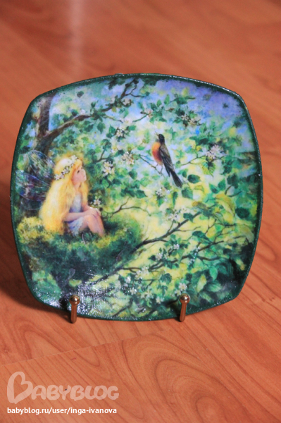 Ход работы: распечатку покрасила 3 раза лаком, сохла ночь, замочила в воде, тарелку обезжирила, приклеила распечатку. Феечка, птица и белые цветы выделенв 3D гелем, сделала зеленую окантовку. Сверху покрыла лаком.