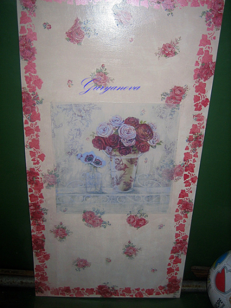 ход работы: зашкурила поверхность, загрунтовала, зашкурила, наклеила распечатку, покрыла пва, нанесла краску основную, приклеила мотивы, покрыла несколько слоев лака, зашкурила, и еще 5 слоев лака, окантовка трафаретом