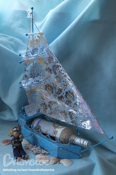 Корабль:вырезала из пеноплекса заготовку для корабля,обклеила её салфетками,установила бортики(зубочистки),покрасила голубой краской,затем оттенила серебрянной,добавила мачту с парусами и остальные декоративные элементы.