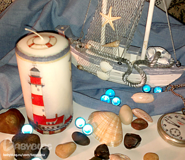 Очень не хотелось делать морскую тему, но других салфеток под рукой не нашлось. Делала с использованием двух методов: основной мотив с помощью кисти, а окантовку с помощью ложки. Каждый способ имеет свои преимущества и, увы, недостатки. Какой больше мне подходит пока не определилась. Но делать свечи мне очень понравилось! В процессе изготовления уже еще есть свечки)))