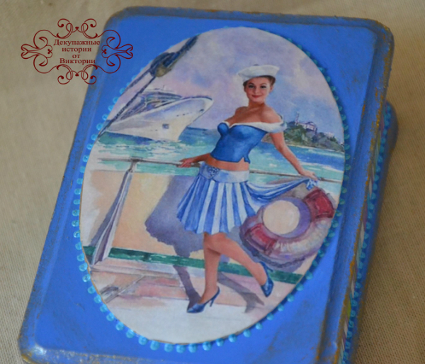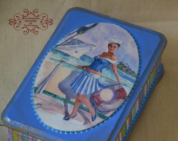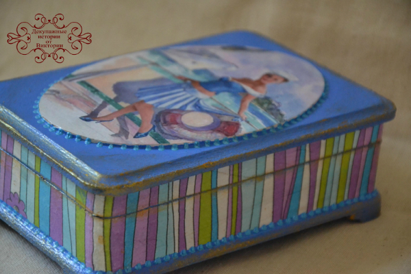 Подготовила распечатку, истончила. Наклеила на медальон. По боковине шкатулки отмерила салфетку, наклеила. Закрасила акриловой краской, сверху прошлась сухой кистью золотой краской. Контуром обозначила картинку. Покрыла акриловым лаком.