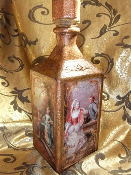Светуль! очень нравится бутылка!! все очень гармонично: картинки, кракелюр и цвета подобраны превосходно! Браво!!