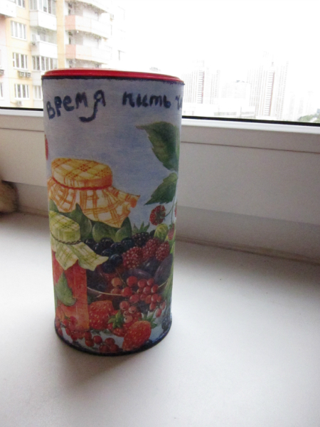 Но я пока не выставляла работу, т.к. хотела узнать мнение по поводу цвета канта, сейчас пока могу исправить, если вдруг нужно перекрасить, банка еще не покрыта лаком. Сделала фото стороны, где видно, что у меня синяя надпись на банке "время пить чай". Оставить синий кант? если да, то покрою лаком, нормально сфотографирую и выложу работу.