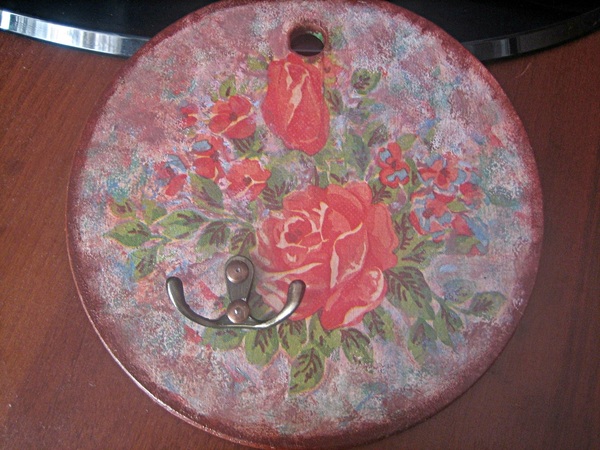 зашкурила основу, загрунтовала несколько раз, зашкурила, салфетку опрыскала лаком для воос, приклеила мотив к досочке пва. просушила, покрыла лаком несколько раз, с промежуточной сушкой каждого слоя, зашкурила, и начала наносит чпоками краску разных цветов губкой, просушила прошкурила, покрыла лаком в несколько слоев, зашкурила нанесла окантовку, покрыла лаком и прикрепила крючечек.