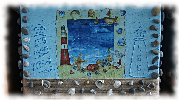 Наши шедеврыОдной оказалось мало, поэтому сделала еще одну коробочку, так же в морском стиле под мой рукодельный уголок. Продолжаю его обставлять.