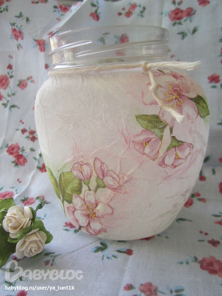 3. Приклеяла одни слой салфетки на баночку.Подождала до полного высыхания.