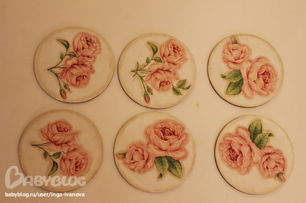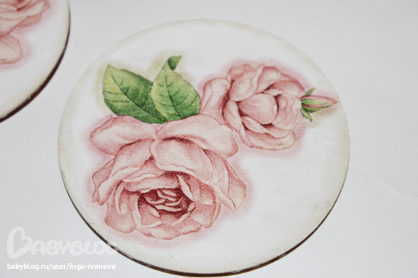 Покрыла заготовки белой краской 2 раза, наклеила мотив. Смешала пастель розовую и коричневую, зеленую и коричневую, сделала тени. Долго думала, как сделать окантовку, т.к. краской очень ярко получалось и решила тоже сделать пастелью. Покрыла шелковисто-матовым лаком. Получилось, как будто состарено.