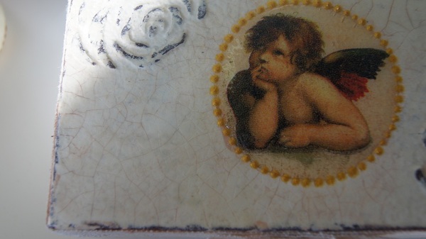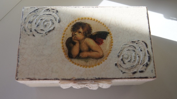 Ход работы: На готовую шкатулку нанесла шаг один, подождала примерно 30 минут. Нанесла втрой слой. Ждала сутки (а нужно было бы и дольше, потому как трещины потом еще появились). Пальцем аккуртно втерла золотые тени, смыла водой. Просушила хорошо, нанесла лак спреем. Просушила и нанесла финишный лак в два слоя. Ангелочка покрыла 3D гелем.