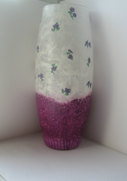 вазу обезжирела, покрыла клеем пва. Порвала рисовую бумагу на кусочки наклеила ее. подготовила яичную скорлупу приклеила ее на пва., покрыла ее краской, приклеила мотив на сколупу. полностью вазу просушила прошкурила. Наклеила вырванные мотивы на поверхность из рисовой бумаги. покрыла несколькими слоями лака, просушила, пошкурила, и покрыла еще несколькими слоями лака