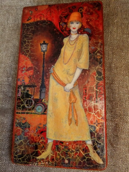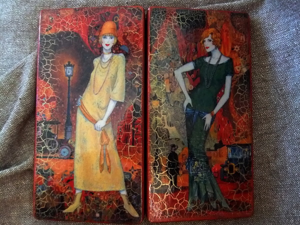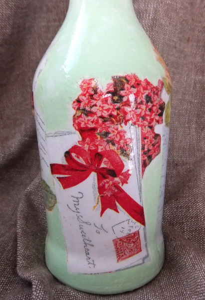 В купюрнице использовала распечатки, акриловые краски, лак, двухшаговый кракелюр, затирка "Золото", салфетка для внутренней отделки. Для бутылочки использовала салфетку, акриловый лак, краску, 3-д гель.