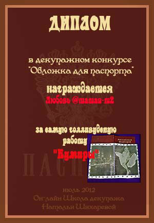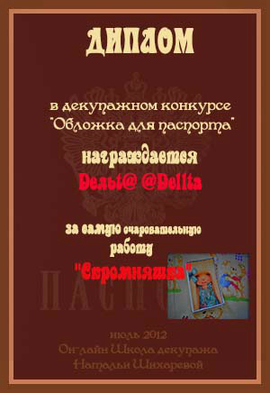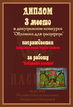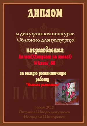 Альбина в ОН-ЛАЙН ШКОЛА ДЕКУПАЖА НАТАЛЬИ ШИХАРЕВОЙ 13 лет Дипломы по результатам декупажного конкурса "Обложки на паспорт и документы" Конкурсные работы Посмотрите еще 20 записей на эту тему Отменить Ответить Виктория - мастер ногтевого сервиса спасибки упащила 17.10.2012 Ответить Дипломы по результатам декупажного конкурса "Ты морячка, я - моряк..." Результаты конкурса! Чаты Беременных Выберите чат: Январята-2026 Февралята-2026 Мартята-2026 Апрелята-2026 Майчата-2026 Июнята-2026 Июлята-2026 Августята-2026