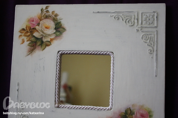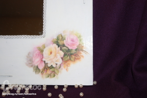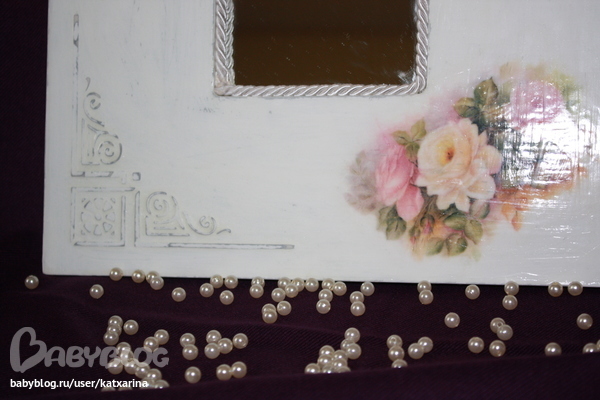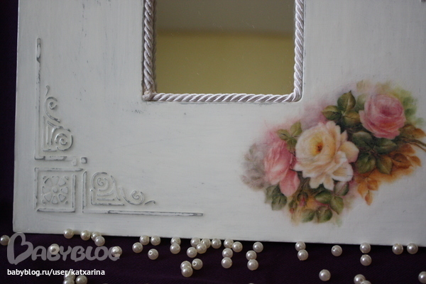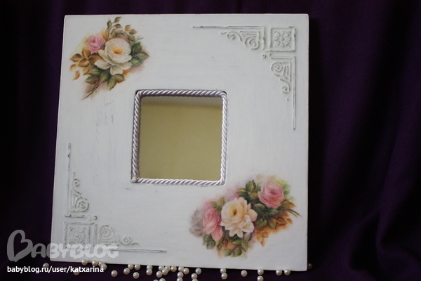 Ход работы: загрунтовала акриловым грунтом, после высыхания с помощью рельефной пасты и трафарета нанесла рисунки, дождалась когда высохнет и зачистила немного мелькой нождачкой, далее покрыла базовым цветом, в первом случаее умбра жженая, во втором серый акрил, после высыхания натерла работы свечкой, далее покрыла в первом случае сливочной краской, во втором белой, после высыхания начила затирать хозяйственной губкой (жесткой стороной), далеее покрыла лаком. после высыхания вырезала матив из рисой бумаги в первом случае и вырвала матив во втором случае, и приклеила на клей лак для декупажа, после высыхания покрыла 3 слоями лака, зашкурила, 3 слоя лака зашкурила и т. д. На зеркале около 20-25 слоев, на рамке чуть меньше, еше на рамке возле цветов затерла чуть пастелью и покрыла лаком, ну как то так.