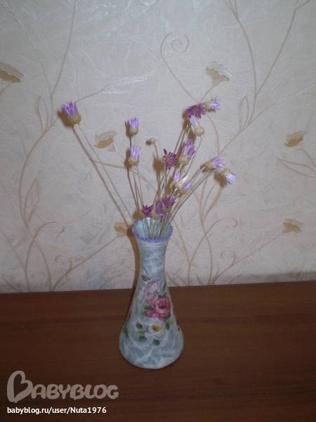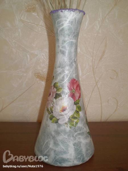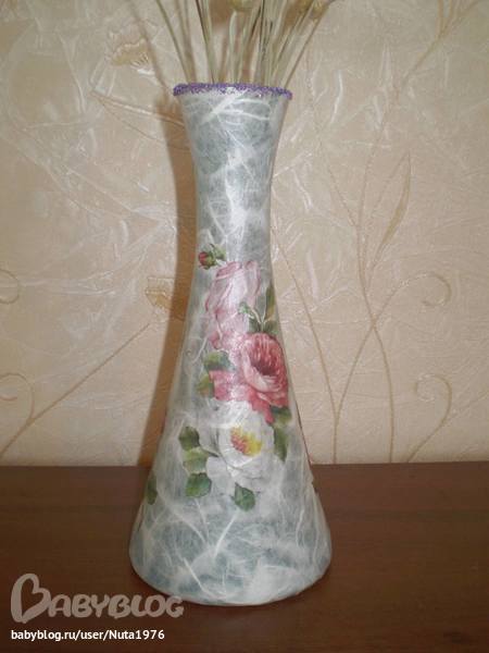 Архив работ к урокамВот такая вазочка получилась. Была просто ваза из голубого стекла. Обезжирила, поклеила рисовую бумагу, пошкурила, приклеила мотив. Покрыла 3 слоями лака, пошкурила, покрыла еще слоев 5 лака. На ободок на лак приклеила шарики для маникюра.