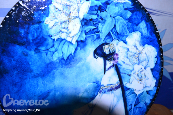 4. Нанесла клей на тарелочку, приклеила мотив, избавившись от пузырьков иголкой.