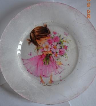 на тарелку наклеен мотив, чуть подсобран кисточкой по краям. Один слой салфетки, мелкие складки (просто не разглаживала морщинки), второй слой с крупными складками (слой салфетки клеялся от краев в центр (сначала по основанию тарелки, затем так же по ободу), мне так удобнее было формировать складки. После высыхания клея зашкурено, залачено. чуть по краю оттенила розовым перламутром, тем же цветом немного подкрасила с обратной стороны платье и цветы. по ободу тонкий край бронзы, видно только сбоку, и еще немного бронзы по дну тарелки чуть растерто (на фото видно оба обода, реально выглядит красиво и оттенет мотив). залачено.
