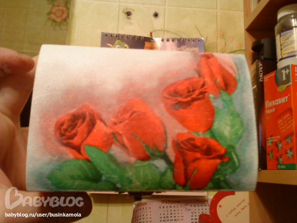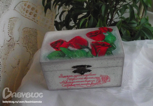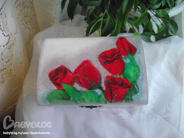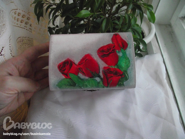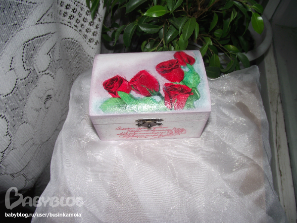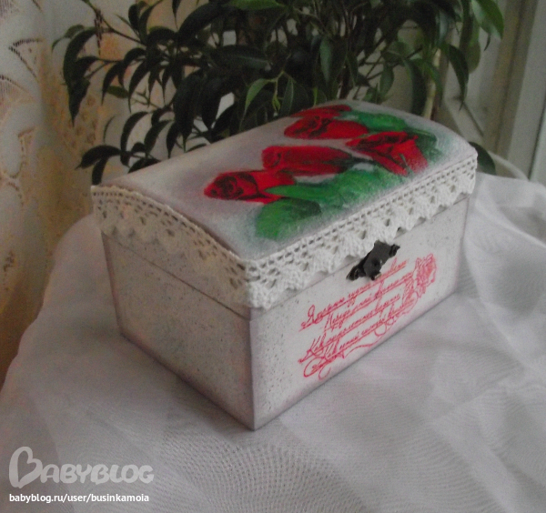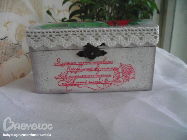 ход работы: заготовку зашкурила, загрунтовала, покрыла белой краской, приклеила мотив, залачила, сделала тени(долго и мучительно...)покрыла лаком несколько слоёв, прошкурила, ещё лак, сделала штемпик, залачила, брызги, залачила, оформила края. залачила, в несколько слоёв, украсила тксьмой