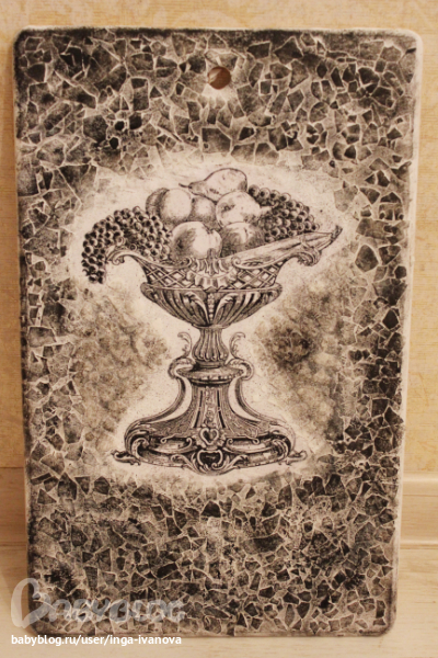 Доску покрасила белой краской, приклеила скорлупу, потом мотив, покрасила губкой скорлупу черной краской, а на мотив сделала брызги. На самом деле этот урок дался тяжелее всего, т.к. раз 7 переделывала (7 разных заготовок), но все не нравилось. Т.к. скоро экзамен, решила эту доску выложить, т.к. уже нет времени, что-то еще придумывать