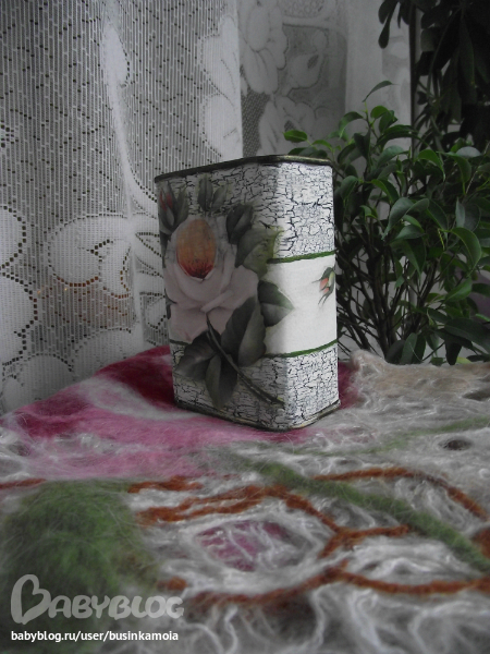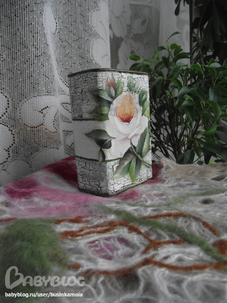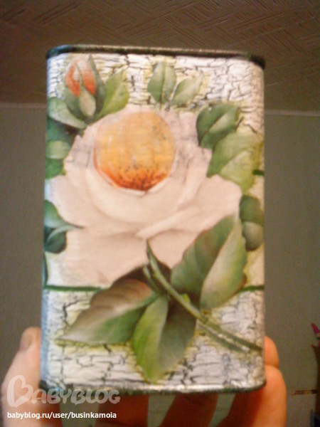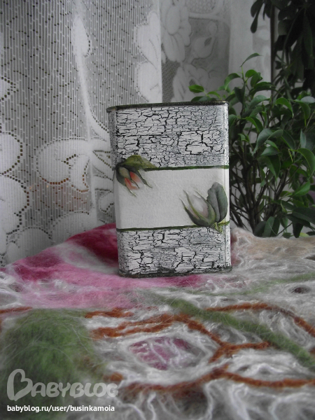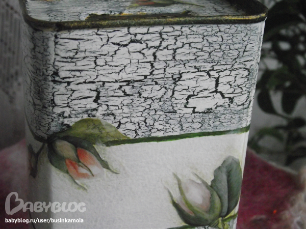 металлическую поверхность зашкурила для лучшего сцепления, обезжирила спиртом, загрунтовала, покрыла белой краской, потом смешала т-зелёный цвет и покрыла им верхюю и нижнюю част заготовки, как основой под кракелюр, нанесла кракерюл, когда чуть подсох нанесла белую краску, пока всё сохло вырезала мотив из д. карты, замочила ненадолго в воде, промакнула нанесла клей на заготовку и мотив и приклеила его к заготовке, просушила, порыла лаком, сделала тени, по верхнему и нижнему канту прошлась золотом, покрыла лаком в несколько слоёв