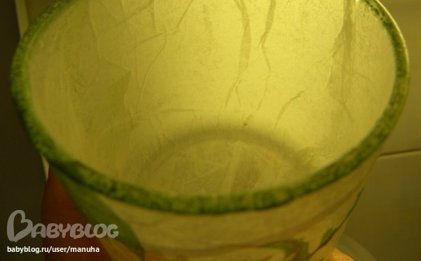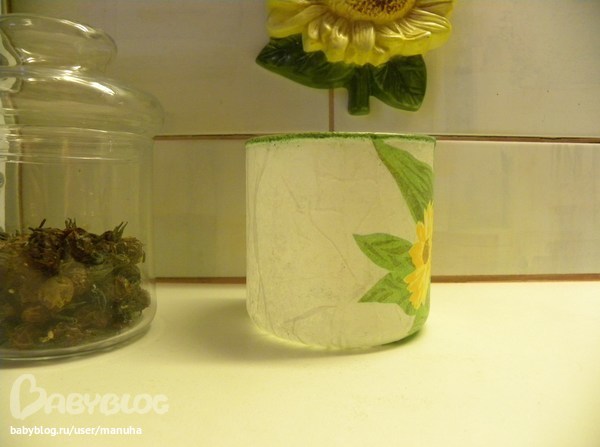 обезжирила баночку, наклеила 1 слой белой салфетки (ПВА 1:1 с водой), постаралась без складок, но всёравно что то замялось слегка. После просушки наклеила второй слой белой салфетки со складками. После просушки наклеила мотив (ПВА 1:1 с водой). После просушки покрыла лаком в 2 слоя. зашкурила и сделала ободок зелёной акриловой краской. Затем 3-4 слоя полуматового лака