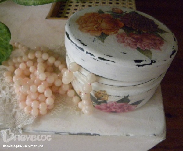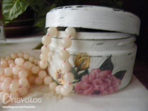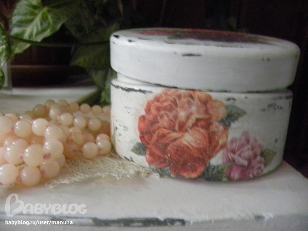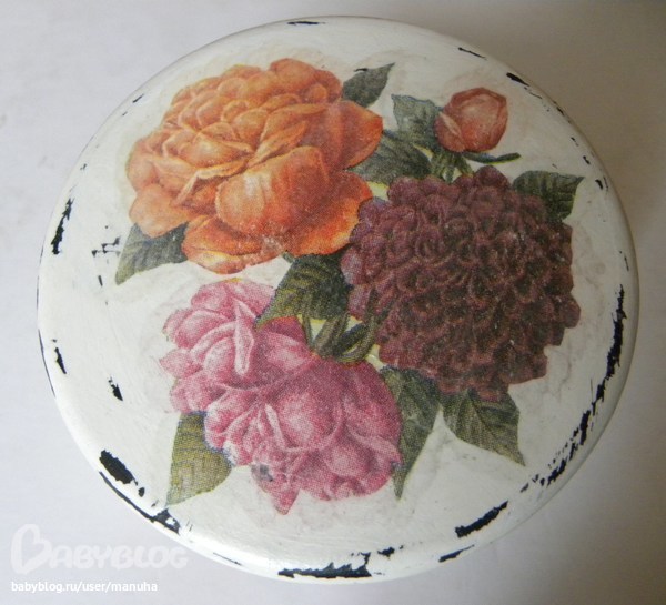 Сняла с баночки этикетки, обезжирила. Покрыла грунтом (ПВА 1:1 с водой). Затем коричневой акриловой краской, просушила. Потёрла свечкой края и некоторые места на поверхности. Сверху нанесла белую акриловую краску. После просушки пошкурила в тех местах, где свечкой потёрла. И приклеила мотив (ПВА 1:1 с водой). На крышку нанесла методом файла, на бока лужицей. Затем попыталась цветы сделать менее яркими ПВА с каплей белой акриловой краски. Затем нанесла тени, наверное сделала это рановато, т.к. потом в лак тоже пару раз добавляла белый акрил и тени соответственно тоже побледнели. Лак полуматовый.