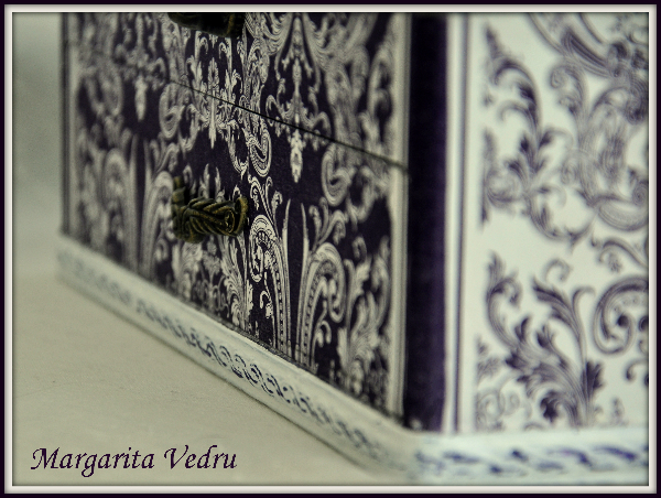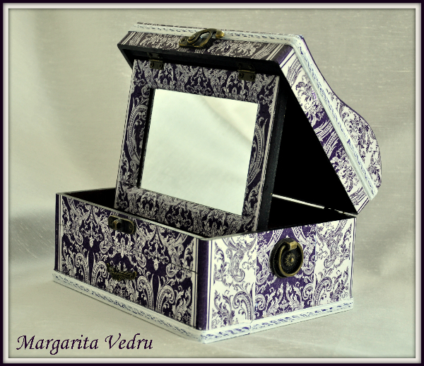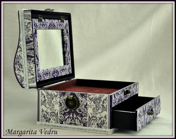Было у меня 2 очень красивые одинаковые салфеточки, вот именно этими салфеточками ларец и обклеен, должна признаться что салфеток хватило тютелька в тютельку, даже обрезки не выкидывала, переживала что на зеркало не хватит. Материалы: грунтовка, салфетка, клей для декупажа, полуматовый лак Тиккурила (мой любимый). На торцах нарисовала узор текстурным контуром и сделала потертости методом Шебби-Шик. Внутри отделка велюром.