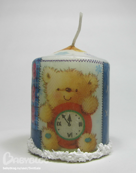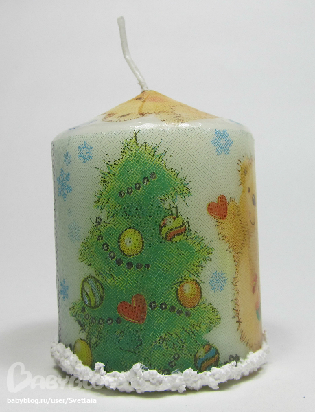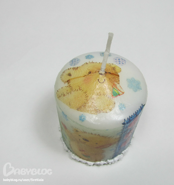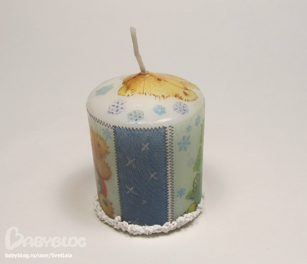 Вырезала несколько мотивов из салфетки, утопила в свечку методом горячей ложки. Снизу нанесла структурную пасту иметирующую снег.
