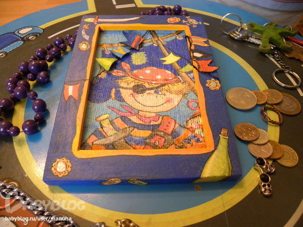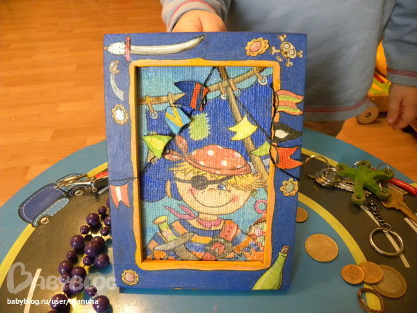 Пошкурила рамку, покрыла белым акрилом, проллеила рамку из салфетки "лужицей". Покрыла ПВА 1:1 с водой. После того как высохло разгладила складки круглой ручкой от кисти. Затем дорисовала часть бутылки, внутреннюю часть рамки жёлтым и внешнюю синим. Белой перламутровой акриловой краской с блёстками подрисовала "драгоценные" камни. Приклеила флажки на верёвочке. Флажки делала так же как и картинку - декупажем на ткани и дорисовала чёрный контур. Вставила картинку в рамку.