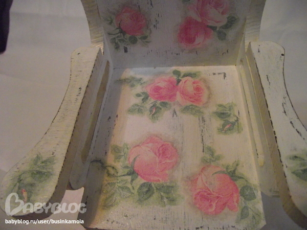 Ход работы: заготовки зашкурила, загрунтовала, нанесла краску жжёная умбра, потёрла свечкой в местах. где нужны потёртости , потом покрыла белой краской, после высыхания пошкурила - получились потёртости)) выркзала мотив из салфетки и приклеила на заготовки, зделала тени и покрыла несколькими слоями лака с добавлением белой краски, чтоб приглушить цвет... и вот что получилось))