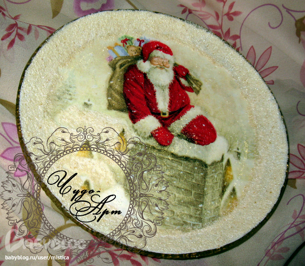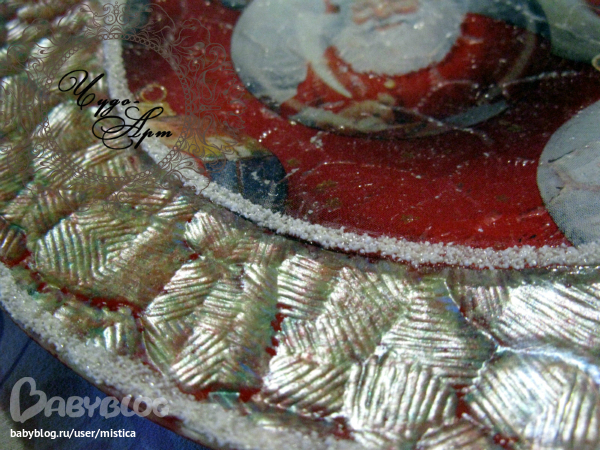 Я читала можно двумя способами, либо смешать ее с ПВА и наносить либо просто посыпать на поверхность предварительно смазав ее клеем. Я делала без смешивания с ПВА, потом закрепляла лаком сверху, в случае с прямым декупажом все ясно- после того как манка высохла, сдула ее остатки и сверху на всю поверхность нанесла лак. В обратном декупаже, я клей прямо из тюбика, он такой с узким носиком, нанесла по контуру мотива и по краю терлки и так же засыпала манкой, после высыхания сдула остатки и очень аккуратно нанесла лак ТОЛЬКО на "манные полоски". Мне понравился тоже этот способ(после покрытий глянцевым лаком... блестит как настоящий снежок на солнышке!), в полне себе заменяет структурную пасту имитирующую снег, баночка которой стоит под 300 рЭ в магазе, при том условии что это "сезонный" товар.... хотя.. если задуматься, такой структурой можно и песок имитировать (после высыхания покрасить в соответсвующий цвет акр. краской), а может еще куда-нить сгодится)))