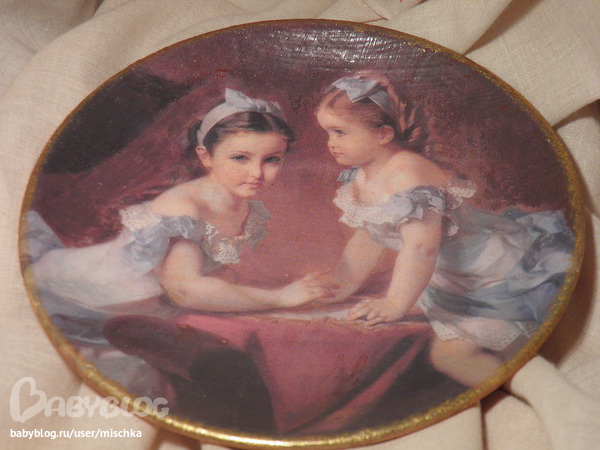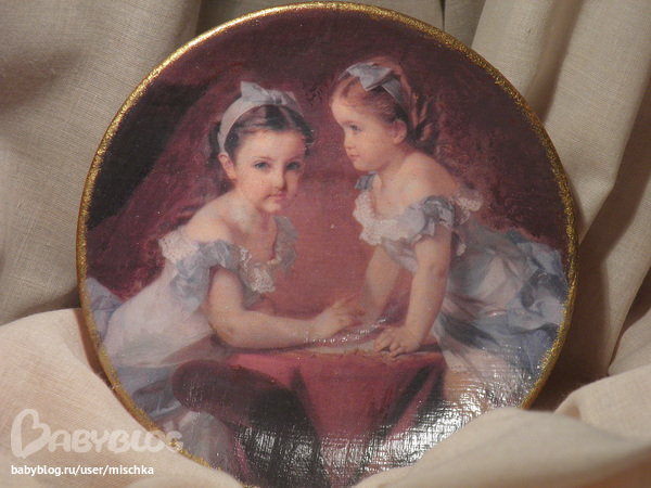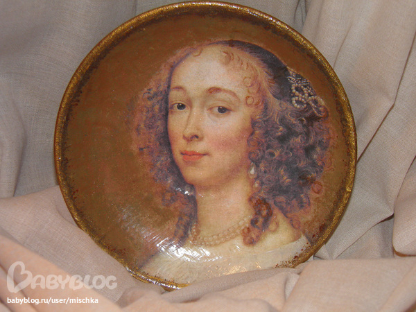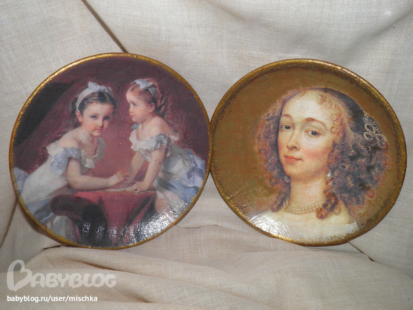 2. Нашла старый бумажный календарь с картинами известных жудожников. Выбрала две (чтобы наверняка!) картинки, покрыла лаком, вырезала по размеру тарелок, истончила, сделала вытачки. (Был еще другой календарь, но с тех картинок почему-то потекла красная краска)