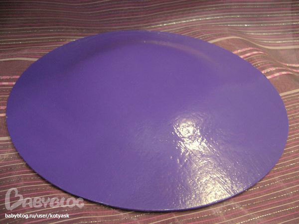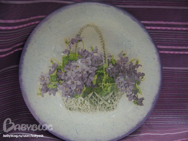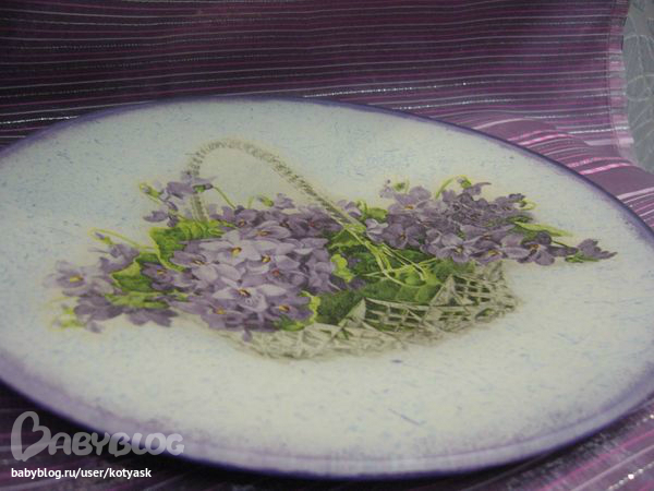 * Тарелку с цветами прочпокала мятым пакетом. Когда краска высохла, нанесла слой фиолетовой краски. Затем еще 3 слоя фиолетовой краски (с просушкой).