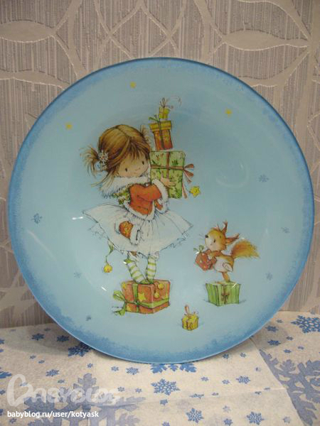 * На тарелке с девочкой зубочисткой процарапала звездочки и снежинки (задумывались снежинки, а получились паучки - что показало, что рисоватья я не умею вообще). Когда краска высохла, звездочки закрасила желтой, снежинки синей краской. Затем 3 слоя голубой краски (с просушкой).