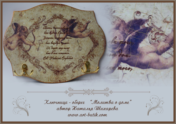 в дизайн включена молитва Св. Николая Сербского о доме по желанию заказчицы. На обороте ключницы крючки для подвеса из витого шнура. Кракле шеллак и гумик.