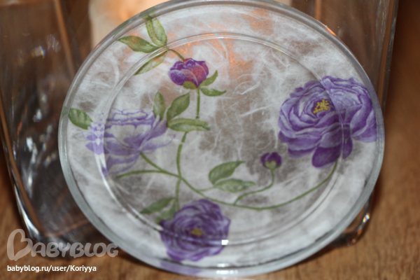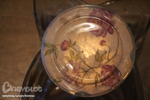 Изначально у меня была задумка сделать прозрачную мисочку-салатник с имитацией под рисовую бумагу..Я даже подобрала мотив и наклеела его..А дальше пришла моя мама,воскликнула:"Ах, какая красота,но только чего это у тебя ангел на дне?Его же не видно!".И дальше пошло-поехало:салфетки рвуться одна за одной,после энной попытки вместе с салфеткой отклеился намертво приклееный ангел!Я выдохнула и отложила пока эту работу в сторону..