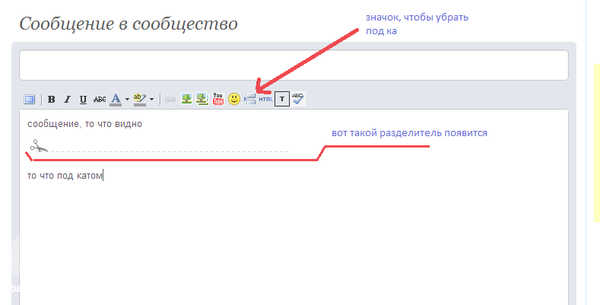 В тескте, где нужно "разрезать" сообщение ставишь курсор и нажимашь "значок, чтобы убрать под кат", появится как бы линия разреза, все что под ней в ленте видно не будет.