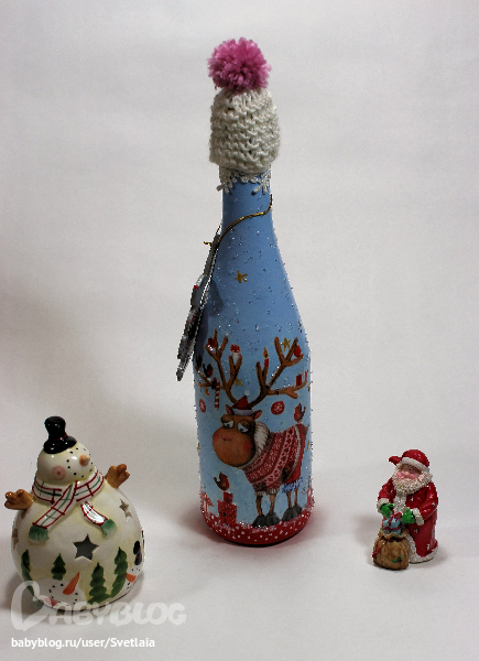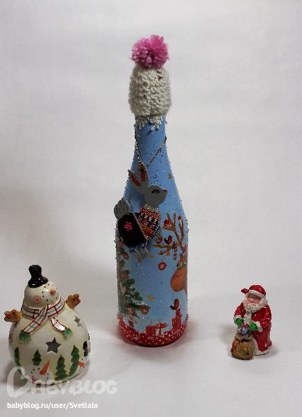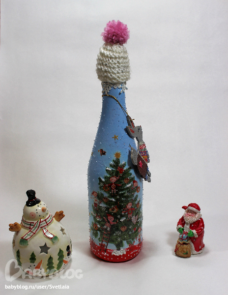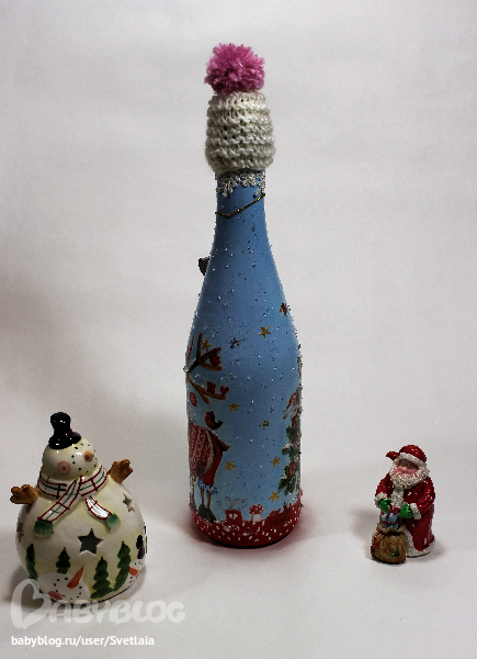 Классная бутылочка, такая снежно-искрящаяся!!! А шапочка - это вообще супер идея, утащу себе.