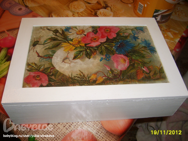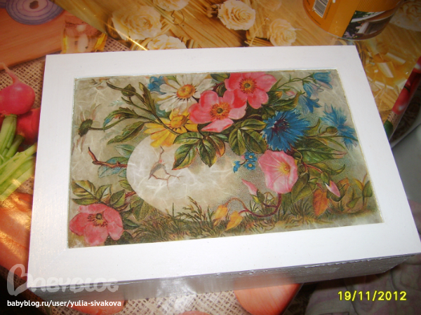 Мотив очень красивый... как его "продолжить" нужно пробовать... состарить(кракле, потертости(допустим "шебби-шик", можно с исп. трафарета какого-то узора ), с помощью сухой кисти и т.д.), можно попробовать сделать что-то фактуроное на коробочке (мозайка из скорлупы, рельеф с помощью сплфетки).