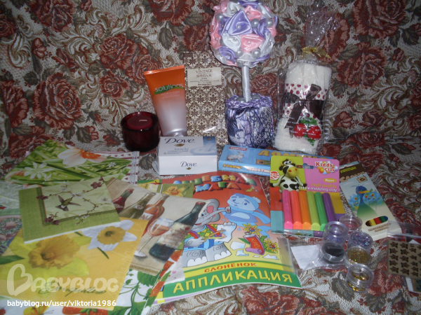 Спасибо нашей феечке, вот такое сокровище мы получили... МАлому книжечки с аппликациями, карандашики, пластилин, доминошки... Маме салфеточки, прибамбасики для маникюра и топиарий, очень чудесный уже занял почетное место на холодильнике))) А так же письмо с приятными пожеланиями.... Спасибо... Вас тоже с Ноступающим Годом