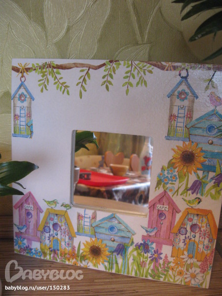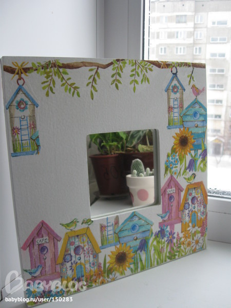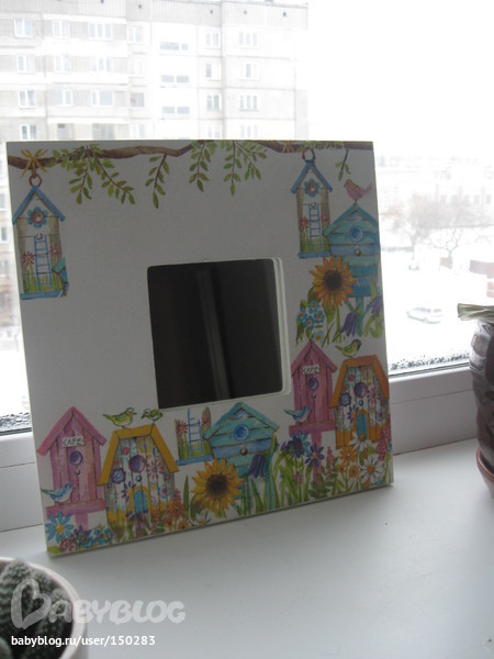 Моя первая работа, зеркало из икеи. Материалы:краска белая акриловая, краски акриловые, клей ПВА, салфетка, лак спрей "какаду", грунтовка-лак для декупажа (неизвестного происхождения, купила в худ. салоне).