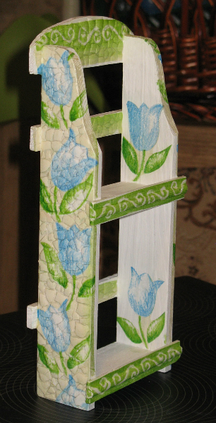 - приклеила зеленый мотив с салфетки по бортикам и цветы внутри подставки