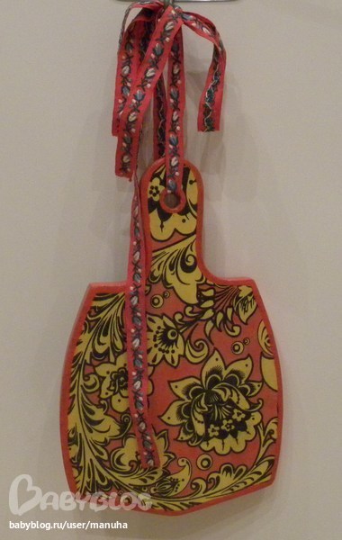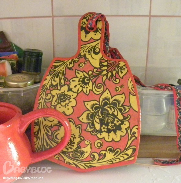 Пошкурила, обезжирила и прогрунтовала доску. Покрасила белым акрилом. Наклеила хохломской сюжет методом файла, приклеила ПВА 1:1 с водой Покрыла матовым лаком 2 слоя. Нарисовала красный кант акриловой краской. Пошкурила. Покрыла несколькими слоями лака, финишный глянцевый