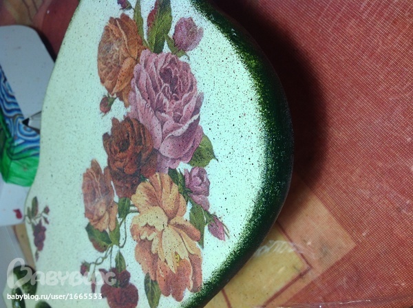 Посоветуйте! (обсуждаем черновые работы)Помогите, пожалуйста, рисовать совсем не умею, цвета смешивать тоже((( Никак не могу подобрать нужный тон окантовки. Зашкурила, загрунтовала в два слоя, по красила в два слоя, нанесла рисунок, закрепила клеем для декупажа, по крыла первым слоем лака Alpina (то что было дома) и все на окантовке застряла