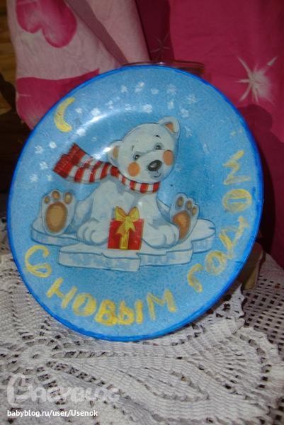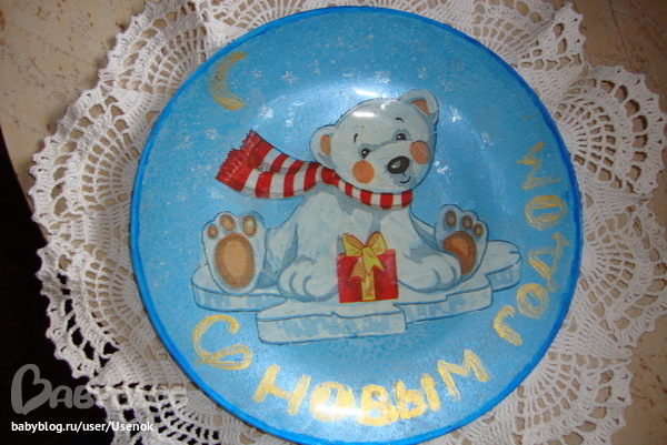 1. Обезжирила тарелку, наклеила с помощью ПВА варезанный мотив