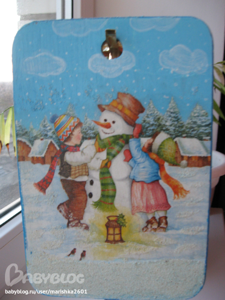 Переделала небо все сошкурила покрасила голубым небо подрисовала облака и снежок. снежок.